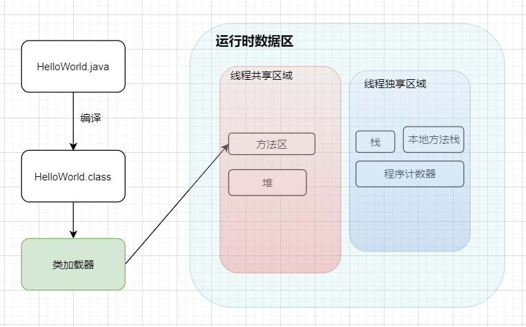 - 编译好 App.java 后得到 App.class 后,执行 App.class,系统会启动一个 JVM 进程,从 classpath 路径中找到一个名为 App.class 的二进制文件,将 App 的类信息加载到运行时数据区的方法区内,这个过程叫做 App 类的加载