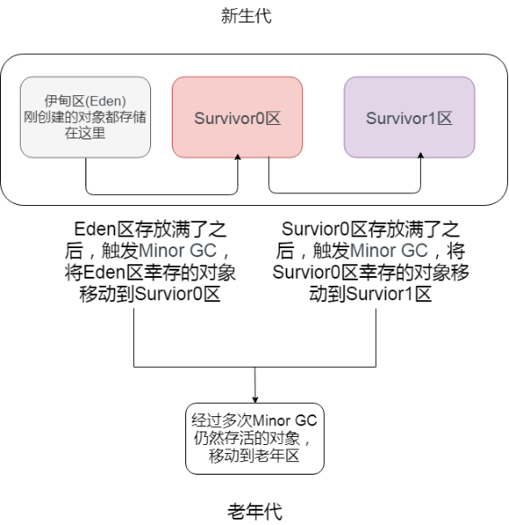 当 Eden 空间满了之后,会触发一个叫做 Minor GC(就是一个发生在年轻代的 GC)的操作,存活下来的对象移动到 Survivor0 区。Survivor0 区满后触发 Minor GC,就会将存活对象移动到 Survivor1 区,此时还会把 from 和 to 两个指针交换,这样保证了一段时间内总有一个 survivor 区为空且 to 所指向的 survivor 区为空。经过多次的 Minor GC 后仍然存活的对象(这里的存活判断是 15 次,对应到虚拟机参数为 -XX:MaxTenuringThreshold 。为什么是 15,因为 HotSpot 会在对象头中的标记字段里记录年龄,分配到的空间仅有 4 位,所以最多只能记录到 15)会移动到老年代。